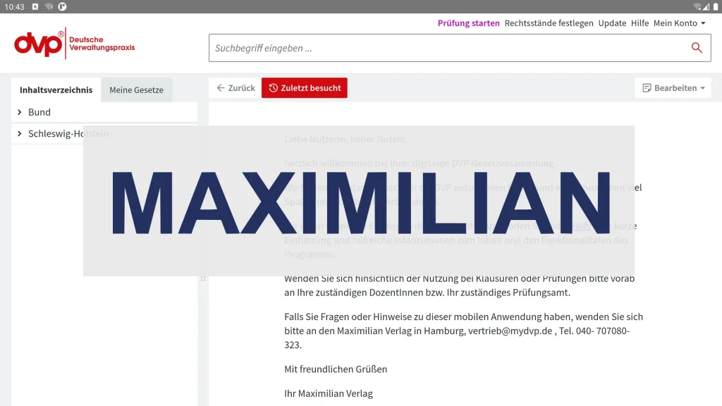 Gemeinsam mit dem Maximilian Verlag wurde die Gesetzessammlung Deutsche Verwaltungspraxis (DVP) in eine digitale, plattformübergreifende App überführt. Ziel war es, Inhalte von Bund und Ländern auch vollständig offline nutzbar zu machen. Besonderen Wert legte der Maximilian Verlag auf die Möglichkeit eines Prüfungsmodus. Die App läuft auf iOS, iPadOS, macOS, Windows und Android und wird über […]
