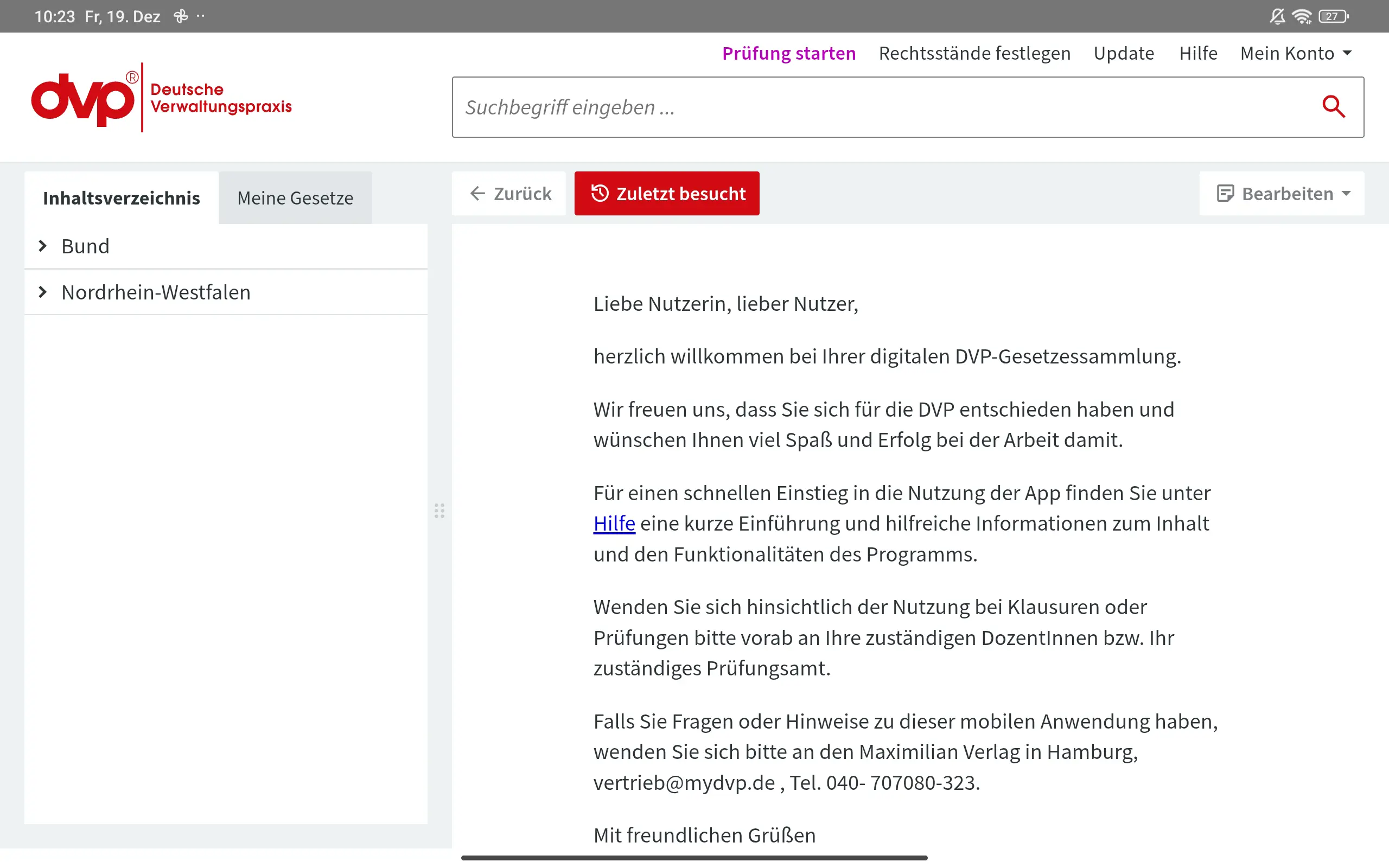 Gemeinsam mit dem Maximilian Verlag wurde die Gesetzessammlung Deutsche Verwaltungspraxis (DVP) in eine digitale, plattformübergreifende App überführt. Ziel war es, Inhalte von Bund und Ländern auch vollständig offline nutzbar zu machen. Besonderen Wert legte der Maximilian Verlag auf die Möglichkeit eines Prüfungsmodus.