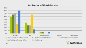 Die einzelnen Elemente des Xavertages wurden ebenfalls sehr positiv bewertet. Hervorzuheben sind das hervorragende Catering, die Vorträge zu neuen Themen sowie der Austausch mit anderen Teilnehmenden (siehe Grafik).