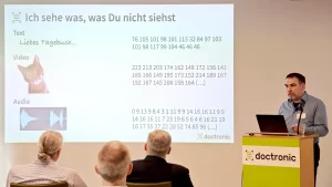 Aus dem Vorjahr wurde die Praxis übernommen, zu Beginn aktuelle Projekte in einer kurzen Projektschau zu präsentieren. Die Projektbeteiligten zeigten in kurzen Vorträgen auf, wie Kunden ihre Herausforderungen mithilfe der Dienstleistungen und Produkte von Doctronic lösen.